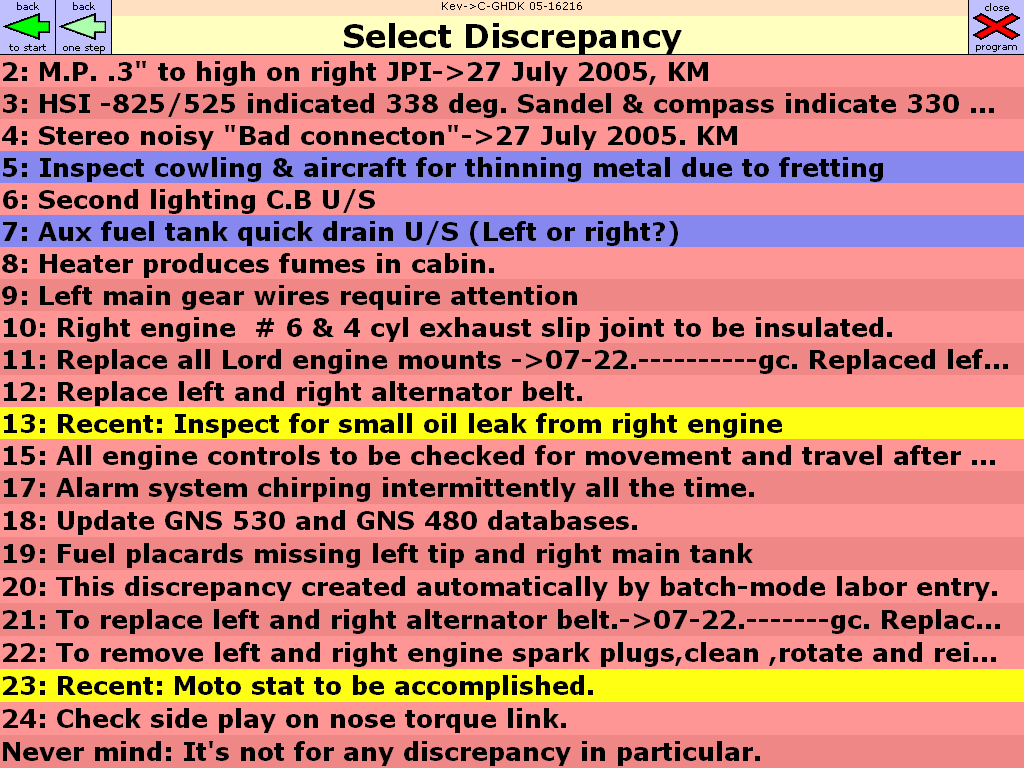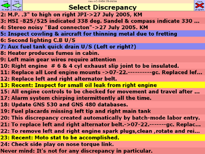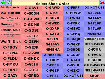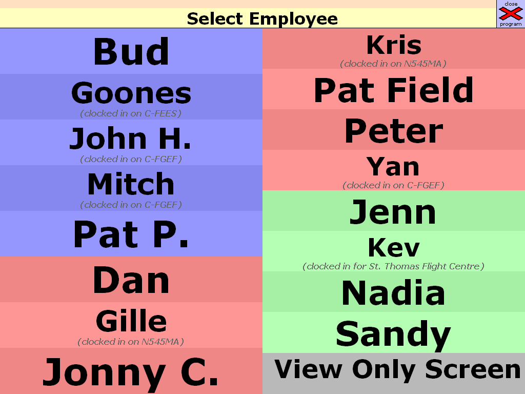 Subcaptions on buttons provide handy information; e.g., on the Employee screen, you can see which aircraft each person is working on (updated every 30 seconds)