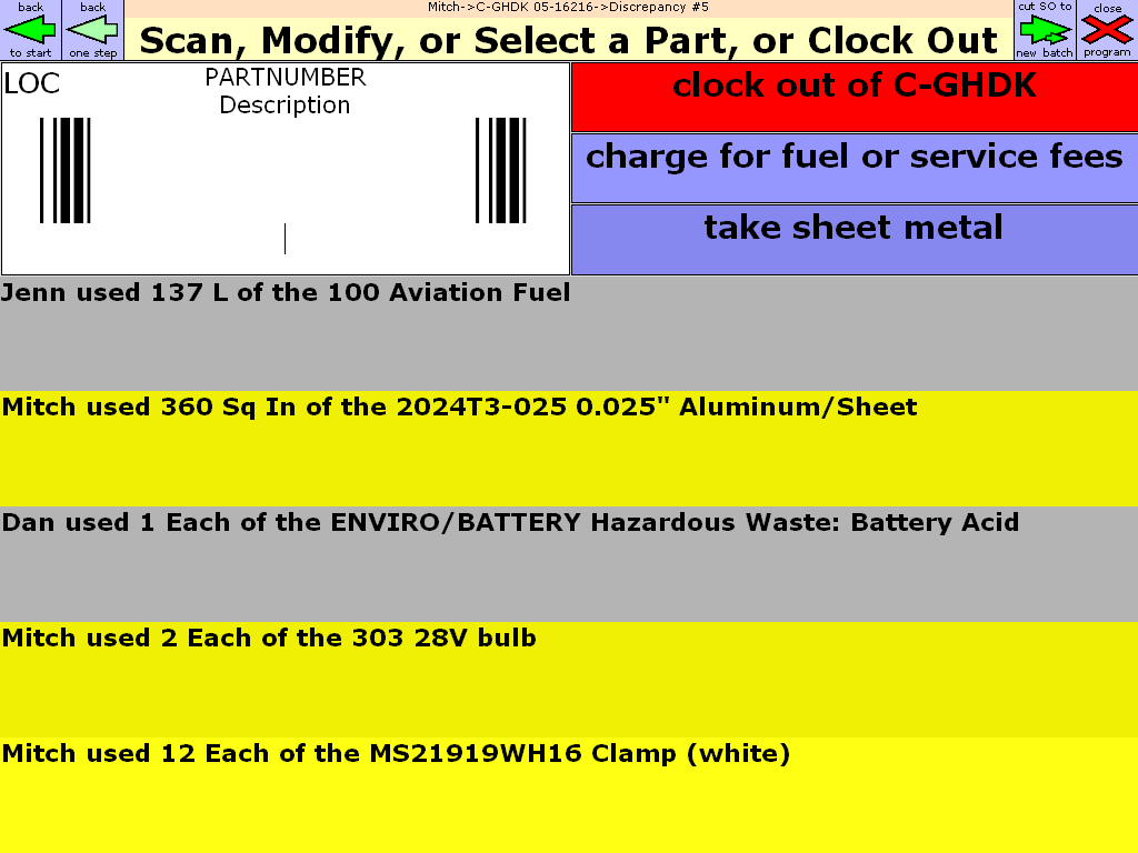 After identifying yourself, similar screens come up by which you select your shop order and discrepancy. After these few clicks, you're ready to scan parts. When you're done, you simply walk away, and after 30 seconds the screen reverts to the beginning again, or before that time you can zoom up to the upper-left corner and click to go back to the start.