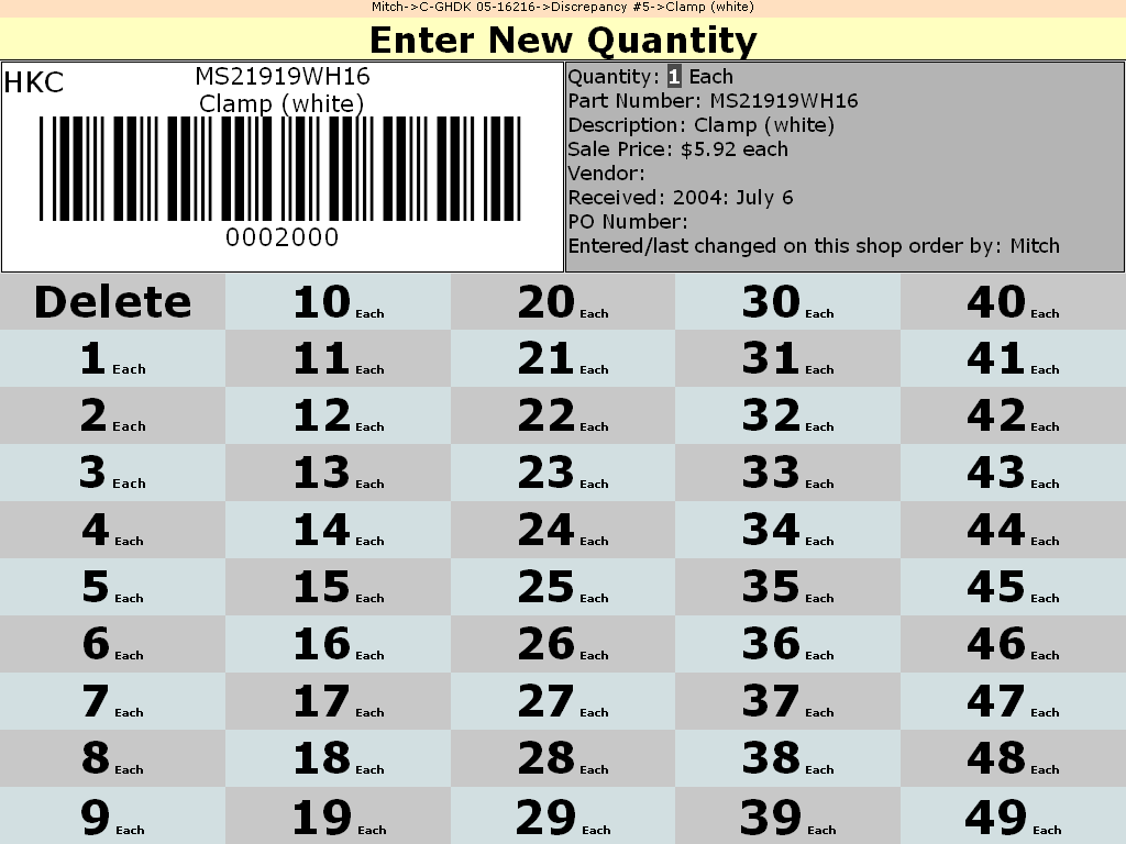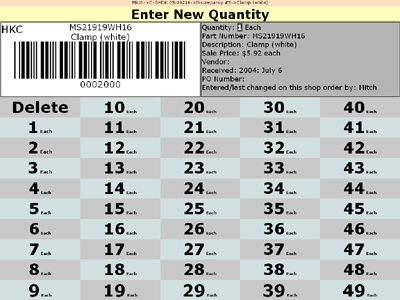 If you actually have no keyboard plugged in or don't want to leave the mouse to, say, pull out the keyboard drawer, you can still enter quantities larger than those on the quantity screen. When you click to modify a parts line, it puts the quantity you're modifying in the middle of the numbers to make it easier to adjust. Click the largest number and the line back and forth a few times, and you're already up in the hundreds. (This isn't the best way to do larger numbers, granted, but 99% of the time people don't take more than 49 of anything. This just makes the rare case possible if you want to only use a touchscreen, and the normal case much easier.)