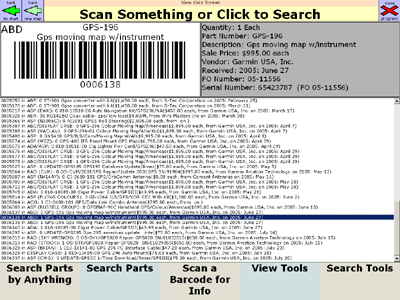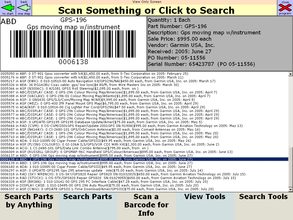 If you clicked the special "View Only Screen" button on the employee screen, you get to here (showing the search results for "GPS"--returned in under a second from around 6,500 inventory lots):
